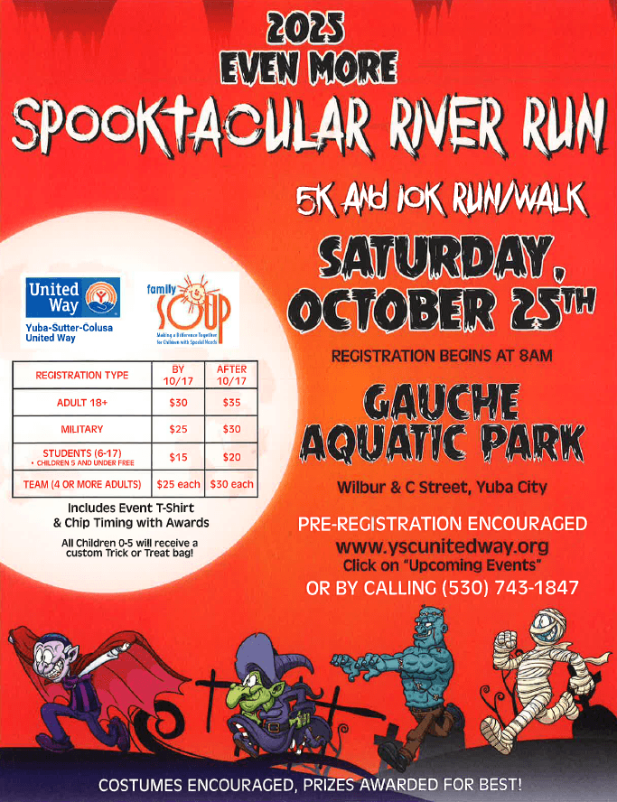 Funds received from the 2025 “Even More Spooktacular River Run” benefit the Yuba-Sutter-Colusa United Way’s 24 non-profit Partner Agencies and our "United Way Born Learning Academy,” and Family SOUP, whose mission is to empower parents with information, workshops, and emotional support helps to ensure that children with disabilities are included as valued members of our community.